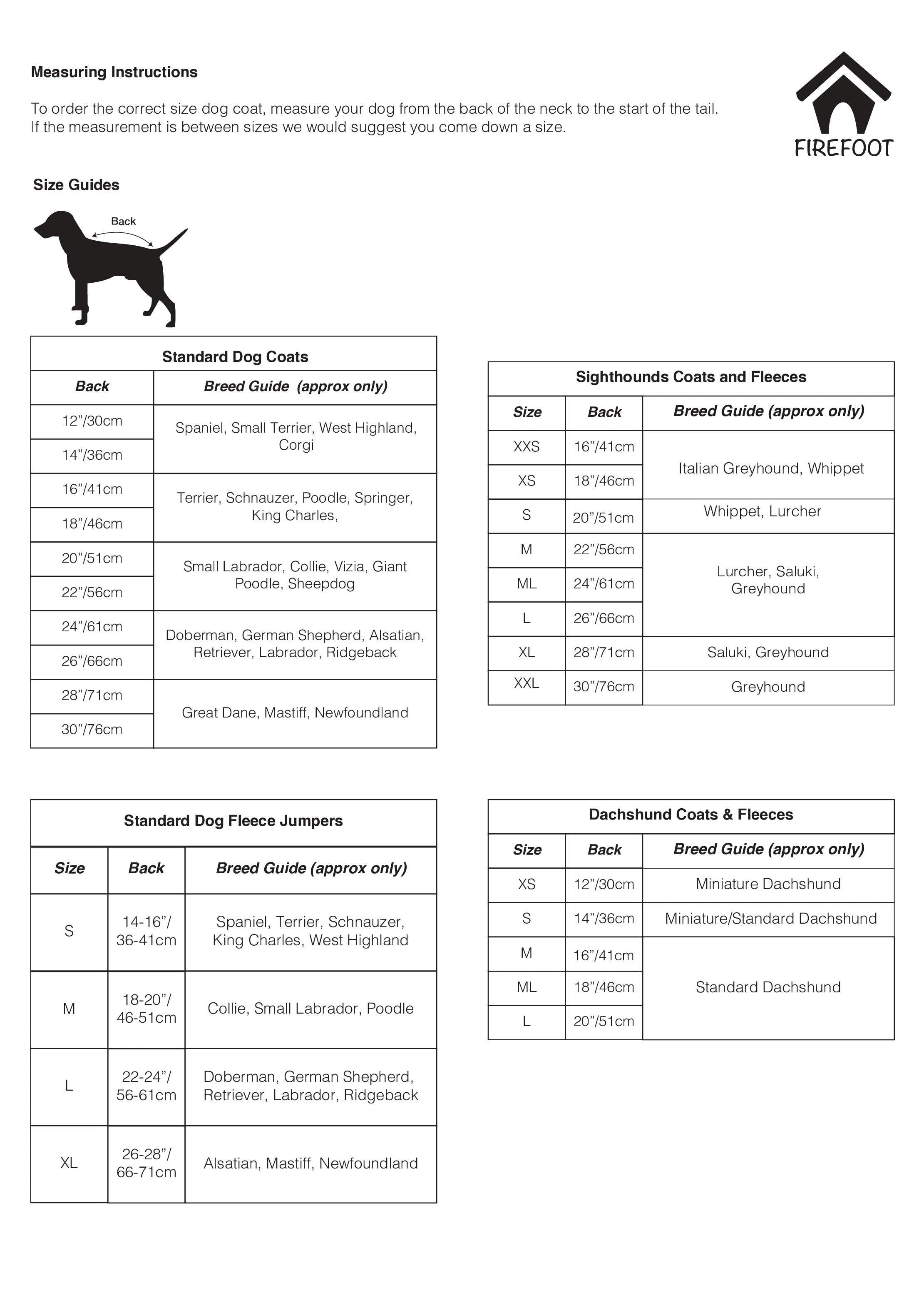 To order the correct size dog coat, measure your dog from the back of the neck to the start of the tail. If the measurement is between sizes we would suggest you come down a size.